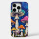This painting depicts a fantastical and surreal grove of mushrooms under a deep blue, starry sky. The artwork is characterized by its heavy impasto texture, with thick, expressive brushstrokes that give the fungi a sculpted and tangible quality. The central mushroom has a prominent turquoise cap with white spots, surrounded by smaller mushrooms with orange and pink caps. The mushrooms are nestled among lush green foliage and vibrant pink and white flowers, creating a whimsical and otherworldly scene.