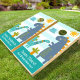 Wherever you set up this cornhole set, you can be rest assured that the summer party fun will continue and add to his special day. Fun, whimsical, playful visuals of two cute, bold, kawaii, turquoise and dusty navy blue brontosaurus and t-rex and fun, handwritten typography overlay a light turquoise blue and white striped background. Personalize with your child’s name or team name along with event, date, or other special message. You can customize each side separately.