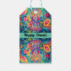 Adding to the charm, tiny diya lamps are interspersed among the floral patterns, their flames painted in warm, golden hues, casting a gentle, ethereal glow. The overall effect is one of joyous celebration, with elements dancing across the tag in a harmonious, colorful symphony.