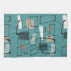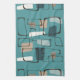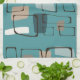 An abstract art design inspired by early 20th century mid century modern patterns, with geometric deformed squares in teal green and gold, with a turquoise background.
