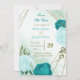 Beautiful save the date card featuring turquoise and light blue flowers and green leaves