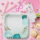 Beautiful wedding paper plate featuring turquoise and light blue flowers and green leaves