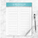 This full page weekly grocery list will help your organize your big grocery shopping trips. It's designed with a turquoise header along the top, and two columns of lines for the groceries you need to buy. There are circles along the right to indicate if you have a coupon for that item, and squares along the left side of each line for you to check that item off as you add it to your cart. This full page notepad is perfect for people who do their grocery shopping in one big trip, and like the color turquoise.