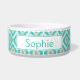 Stylish diamond ikat pattern in teal turquoise and beige color scheme together with a personalizable text area for a pet's name or other custom text such as "dinner" or "water", for example.