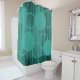 This shower curtain has a mid-century modern design of black vertical lines with circles scattered on top on a field of turquoise.