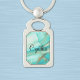 Shades of turquoise marble with gold accent background and a black script name, decorate this 1.8" long 1.1" wide rectangle silver-colored metal keychain. Change name using the simple Template provided. Available shapes: twisted heart, swirl, oval and rectangle (shown). The background and text are printed in full color on a metal insert, fade and scratch resistant. See "About This Product" at side for more information.