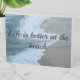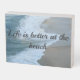 A modern photograph of the turquoise ocean. Sand and surf. Text in black, life is better at the beach. Would look lovely in a beach house, cottage by the sea or for anyone that loves the beach life — casual and fun design.
