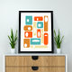 This fabulous mid century modern art print features various rounded squares and rectangles with offset white circles and ovals, in a combination of turquoise, two shades of orange, and cream. This will make a colorful addition to your home!