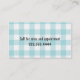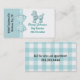 Cute dog themed business card made with a turquoise and white background, with graphics of a turquoise and white gingham ribbon and bow between the two colors. Graphics of a sweet fluffy looking turquoise poodle decorates the top white side of the card, with custom turquoise text under it. Dark gray custom text runs sideways, on the turquoise side of the front. A turquoise and white checkered pattern, on the back of the card matches the ribbon and bow, on the front, and the custom gray text is ready to personalize. Personalize this fun card for your business.