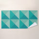 This towel set has a bath towel with a geometric design of triangles that form squares that look like a bird's eye view of pyramids, a washcloth indark turquoise, and a hand towel in lighter turquoise.