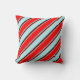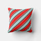 This throw pillow design features a pattern of stripes having colors like turquoise, red, and black.