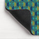 This mouse pad has a mid-century modern design of ovals in teal with semi-circles in green and navy inside them on a field of turquoise.