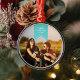 Personalize this elegant round ornament with a favorite photo to commemorate a special year. Customize with your family name and the year in white on a bright turquoise teal ribbon banner at the top.