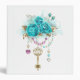 Antique gold key with trendy turquoise roses decorated with leaves of white gold and pink and blue beads. Fashionable color. Turquoise roses. White gold. Blue tiffany.