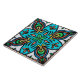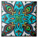 Decorative Spanish tile with colorful elements in turquoise, green, yellow and orange. Symmetrical design with floral and leaf elements.