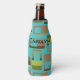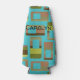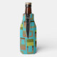 This bottle cooler has a mid-century modern design of rounded rectangles in shades of green and brown with holes in them on a field of turquoise. If you like the design but prefer different colors, message me.