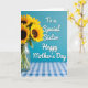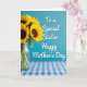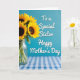 This greeting card shows a sunny bouquet of golden-petaled flowers with rich brown centers filling the left side, their faces angled as if leaning toward someone close ❤️. The blooms sit in a clear glass jar where green stems are visible through the water, adding a quiet, intimate realism. Beneath the jar is a blue-and-white checkered surface that fades softly into the background, like a cozy table scene. On the right, a bright turquoise panel holds a flowing white message placed centrally, leaving generous open space around the words. The cool blue backdrop makes the yellow petals glow, creating a gentle contrast that feels like an affectionate glance shared across the card. Soft, even lighting keeps the colors smooth and inviting, while the simple layout guides your eyes from the flowers to the greeting 🌼. The white lettering stands out crisply against the turquoise, and the checkered pattern stays subtly blurred behind the jar. The composition balances the jar on the left with the turquoise text area on the right, framed by the warm petals and cool background.