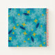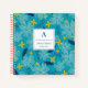 Monogrammed square notebook with a turquoise pattern of tropical flowers in pale blue, dark blue, and yellow. Add name and initial to the white label and the subject of your notebook.