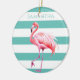 Turquoise and white stripes holiday pink flamingo personalized name Christmas ceramic ornament.