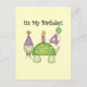 A cute green smiling turtle wearing a party hat carries a lit birthday candle on his back and text reads "It's My Birthday". A helium balloon carries the number 4!