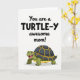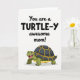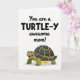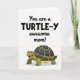 This greeting card features a crisp white background with a sweet, punny message that feels like a warm hug ❤️. Across the upper portion, the text reads “You are a TURTLE-Y awesome mom!” with the gentler words in a flowing cursive style and “TURTLE-Y” in thicker, upright lettering that leans slightly for extra energy. The text is rendered in dark tones for strong contrast, and an exclamation mark finishes the line with a cheerful kick. Below the wording, a friendly cartoon turtle takes center stage, giving off the kind of happy, affectionate energy you’d share with someone you adore. Its shell is deep charcoal with neat golden-yellow segment lines, while its head, legs, and tail are olive green for a lively pop of color 🌼. The turtle’s big black eyes and wide grin, with small white teeth and a pink tongue, create a tender, upbeat expression that feels like a loving compliment. A soft gray shadow sits under the turtle, grounding it against the white space.