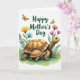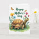 This greeting card shows a sweet nature scene that highlights a caring bond between two gentle reptiles with sturdy, segmented shells. In the lower foreground, the larger one stands close to the smaller companion, their soft faces angled toward each other as if sharing a quiet, affectionate moment ❤️. Their textured scales and rounded shapes feel friendly, and the closeness reads like guidance and comfort. Near the top, the words “Happy Mother’s Day” sit prominently in a medium green tone, centered and easy to read. Around the pair, clusters of flowers bloom from a wash of leafy green, mixing sunny yellow blossoms with soft blue petals and light pink flowers 🌼. Two orange winged insects drift across the upper area, adding a light sense of motion against the plain white background. The foliage forms a loose green patch beneath the lettering, with the orange insects hovering above it.