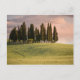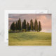 Image of a Tuscan landscape of cypress trees at sunset with the sky turning pink