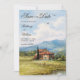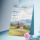 This wedding theme features a hand-painted watercolor countryside scene with sunlit fields, hills and horses. Perfect for destination weddings and vineyard celebrations. A portrait of European countryside landscape. This invitation can be easily edited with your wedding details.