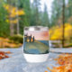 Artistic travel wine tumbler features an AI generated digital watercolor scene of a beautiful sunset over rolling hills in a valley in Tuscany, Italy.