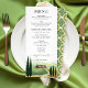 Watercolor Tuscany landscape destination wedding menu card.This Tuscany watercolor destination wedding menu card beautifully immerses guests in the enchanting Mediterranean atmosphere where the couple will exchange vows. The design artfully captures the essence of the region, featuring the iconic rolling hills, cypress trees, and charming villas, all illustrated in soft watercolor tones. Rather than providing a literal representation, the artwork evokes the spirit of Tuscany, while the reverse side showcases a stylish pattern of Mediterranean geometric tiles in earthy greens and browns, enhancing the overall aesthetic of the celebration.