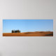 Panorama poster print of a small group of cypress trees in a small forest between the rolling barren hills in autumn in the Val d'Orcia, Tuscany, Italy. Panoramic print, great for home decoration above a sofa.