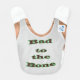 This bib is designed on both sides. The front side sports a tuxedo while the other side is a tank top with the saying 'Bad to the Bone'.