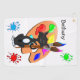 In the foreground is a black and white tuxedo cat sitting upright with his tail curled around two artist paintbrushes. In the background behind the cat is an artist palette with splotches of different colored paints. In the top left corner is a template in black lettering to add your name.