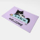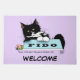 Cute black and white tuxedo kitten sitting in a blue dog's bowl against a backdrop of purple.