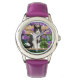 A cute black and white bicolored cat, European Shorthair, sitting on a wooden chair in front of violet garden flowers. Photo taken by Katho Menden. This watch is a gift idea for cat lovers.