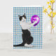Black and white cat with purple balloon and confetti on blue and white gingham background for general birthday.
