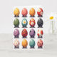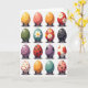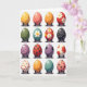 This design shows twelve decorative egg-shaped pieces arranged in a tidy grid, each resting on a small dark stand against a bright white background. Soft, diffused light glides over their glossy surfaces, giving them a smooth, ceramic-like look with gentle highlights and shaded curves. The colors range from sunny yellows and oranges to deep greens, cool teals, and quiet purples, with reds and pinks adding extra warmth like a friendly wink across the display 🌷. Some eggs carry white dots and star shapes, while others feature polka dots that shift from tiny speckles to larger circles, creating little visual “conversations” between neighbors. A few include simple floral motifs with white petals and yellow centers, placed as if they were small bouquets exchanged between close friends 🐇. There is no text on the front, leaving the open white space to frame the arrangement like a gallery wall. Each egg sits centered on its own dark pedestal, evenly spaced in straight rows and columns.