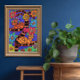 Decorate your walls in style with this unique, colorful folk art poster. The Tree of Life, a tree with many branches, is an archetypal recurring theme in many world cultures signifying the interconnectedness of all life on our planet. It appears in artwork, theology, philosophy and mythology worldwide. In this colorful, whimsical version, these two happy tabby cats are joyfully inhabiting this striped tree of life covered with bright flowers beneath a purple twilight sky. Flowering bushes also appear in the background.
