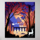 Santa and his reindeer soar across a moonlit bridge surrounded by magical forests and shimmering leaves. A stunning Christmas holiday vibe bathed in deep violet, gold, and sunset orange hues.