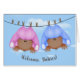 African American twin baby boy and girl hanging on clothesline with cloud and blue sky background.