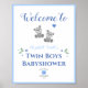 Twin boys baby bears baby shower welcome sign, matching with the invitation. Design features the text "welcome to" along with personalizable text to fit your information perfectly. The illustrations are hand drawn or painted.