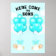 Creative boy twins baby shower decoration featuring twin baby boys beneath blue balloons.