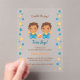 Cute cartoon baby boys in matching blue rompers and yellow bibs holding baby rattles. Lovely and original baby shower invitation.
