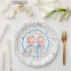 Cute blue watercolor baby shower Twins themed paper plates for twin boys with stuffed animals background. Cute watercolor twin boys dressed in blue with stuffed animal koala bear, bunny rabbit and dogs. Blue and brown gradient.