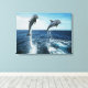 A painting of a pair of dolphins leaping out of the ocean water in synchronicity.