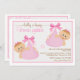 A cute invitation featuring twin baby girls in pink-blanket-bundles with big bows. The framed background has pink flowers against a white base.