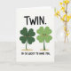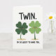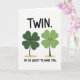 This card shows two four-leaf clovers standing close together in the center of a white background, their rounded leaves giving them a soft, friendly look. One clover is a deeper emerald green and the other is a brighter lime, and their tiny black dot eyes and rosy cheeks make them look a little bashful around each other 💚. Their small smiles tilt inward, as if they’re sharing a private joke between close friends or a sweet pair. Above them, the word “TWIN.” sits near the top in dark lettering, spaced so it feels like a title hovering over the duo. Near the bottom, “I’M SO LUCKY TO HAVE YOU.” is set in matching dark text, centered and easy to read ☘️. Under each clover, a subtle tan oval shadow anchors their bodies and suggests they’re standing side by side. The two green figures are evenly sized, with their stems angled slightly toward the middle and their blush spots glowing against the white space.