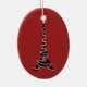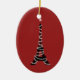 Bright twinkle lights decorate the Eiffel Tower on a festive cranberry red background.