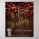 Chic and classy wedding sign poster with rustic twinkle lights, mason jar with white flowers and rust autumn leaves with gold calligraphy script on brown barn wood background. Ideal for your night autumn fall | country rustic themed wedding.