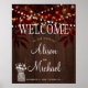 Chic and classy wedding sign poster with rustic twinkle lights, mason jar with white flowers and rust autumn leaves on brown barn wood background. Ideal for your night autumn fall | country rustic themed wedding.